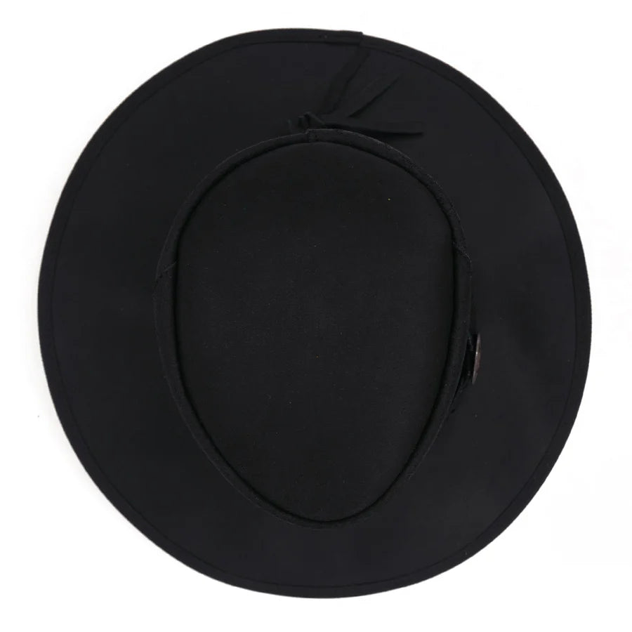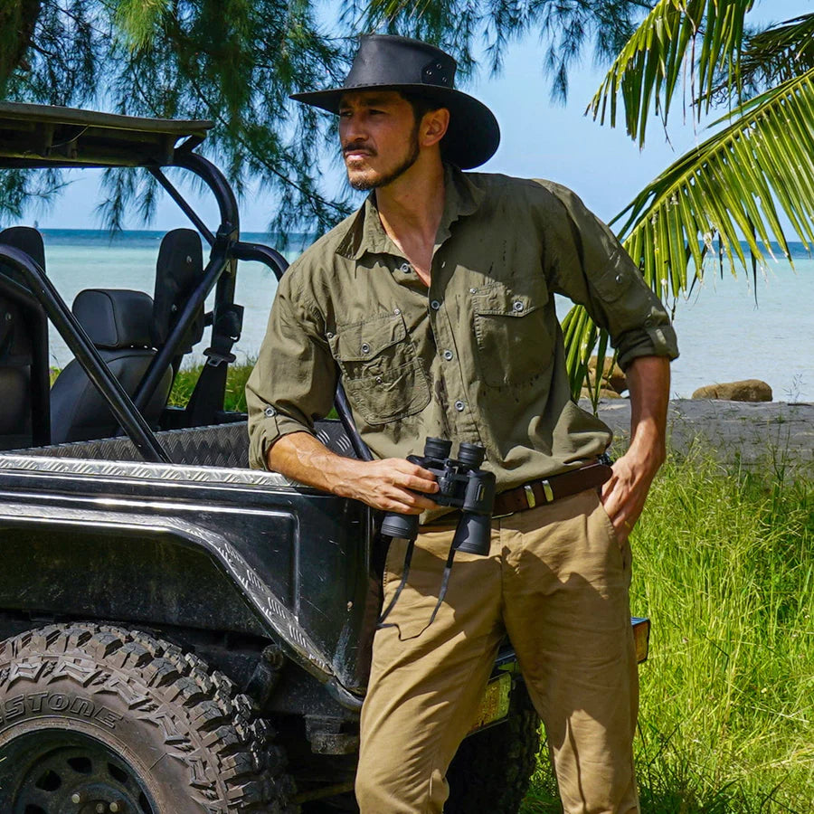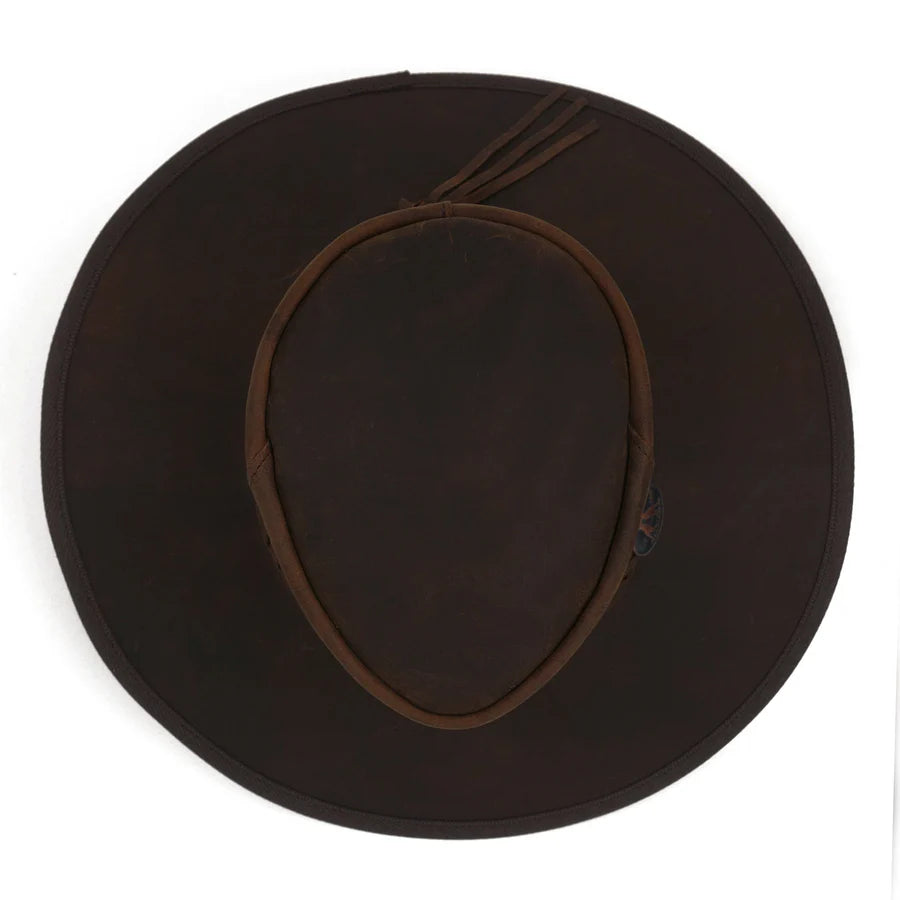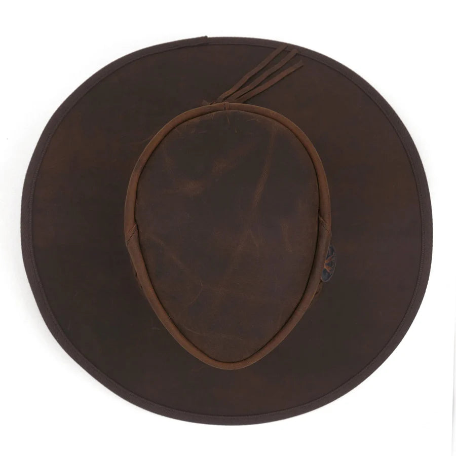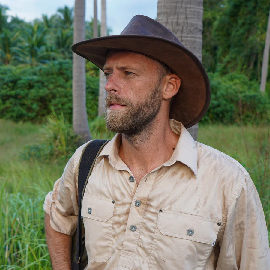 Big Jim's Leather Bush Hat is built tough for true-blue Aussie adventures. Made in Australia from rugged cowhide leather, it features a wide 9 cm brim, 8.5 cm crown, and a UPF 50+ rating to shield you from the harsh sun. With a classic block that suits most face shapes, ventilation eyelets for breathability and a hand-braided hatband, it combines function and bushman style. The chinstrap facility keeps it secure in wild weather, and with sizes from XS to 3XL, it’s made to fit every head. Big Jim is your trusty mate for life under the Aussie sun.