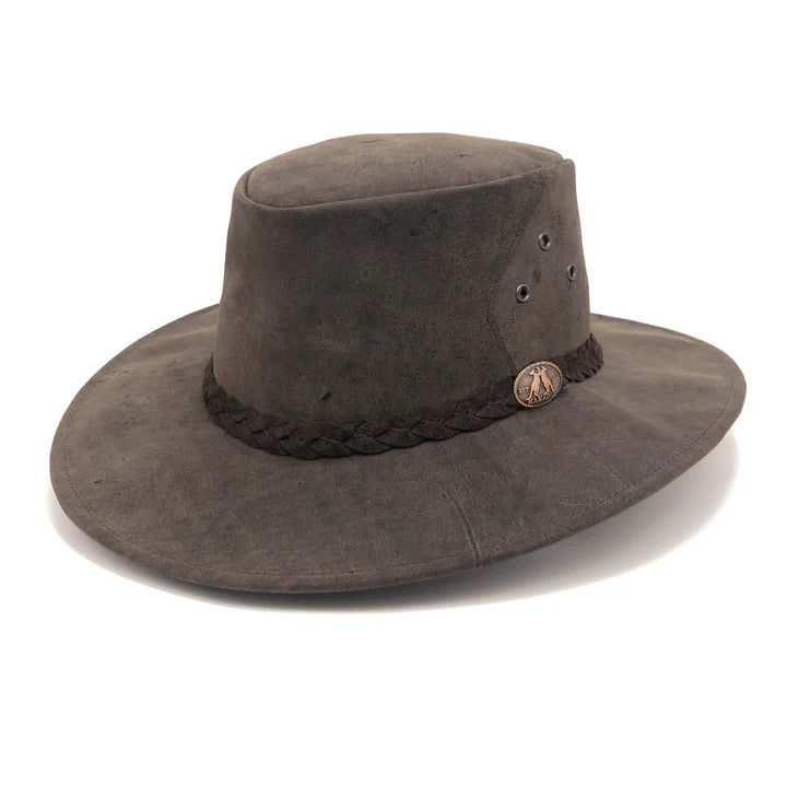 The Gibson Hat is a lightweight legend, crafted from premium waxed kangaroo leather for a perfect blend of durability, comfort, and water resistance. Designed with a classic block, it features a 9.5 cm crown and a 7.5 cm brim - ideal for reliable sun protection with its UPF 50+ rating. Triple ventilation eyelets keep things breezy, while the built-in chinstrap ensures it stays put. Finished with a hand-braided suede hatband, the Gibson is proudly Australian-made and ready for whatever the outback (or the city) throws your way.