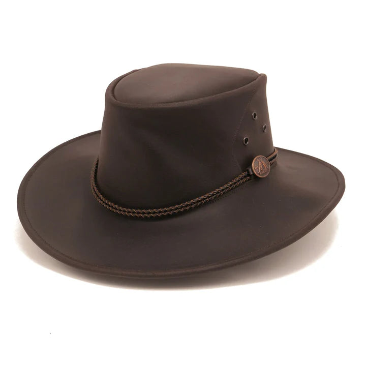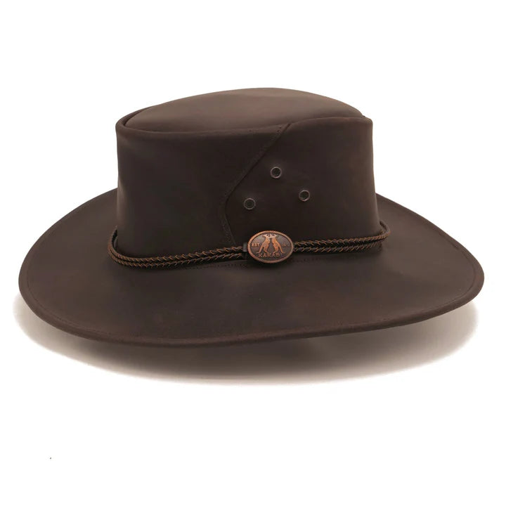 Step into the sun-drenched spirit of the outback with the Mallacoota Leather Hat, a true-blue Aussie classic made for those who live life on the rugged side. Crafted from durable full grain leather and proudly made in Australia, this hat is built to endure the toughest conditions. With a classic block, 7.5 cm brim, and 8.5 cm crown, it delivers the perfect balance of sun protection and comfort. Ventilation eyelets keep the air flowing, while the water-resistant leather keeps you dry when the skies turn. Finished with a double round braided hatband and the iconic Boxing Roos badge, it’s as tough and timeless as the legends who wore it before you. With UPF 50+ protection and a chinstrap facility for windy days, the Mallacoota Leather Hat is your go-to mate for every wild adventure under the Australian sun.