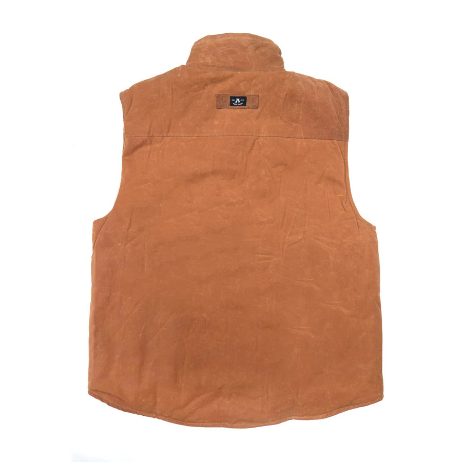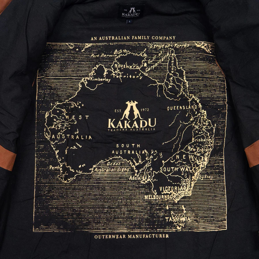 The Shepparton Dry Waxed Cotton Vest is crafted from durable, heavy dry-waxed cotton canvas designed to repel wind and water with a matte, non-greasy finish. It features a pull-up leather collar and trim, a welt chest phone pocket, and light padding for added warmth and comfort. The interior is lined with a unique Australia map print, combining rugged outdoor functionality with urban style.